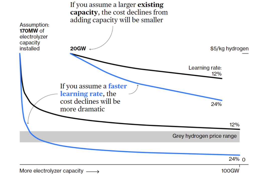 世界正处于可能成为其最重要的能源实验的节点上。 如果能够成功建立一个生产绿色氢气的新工业,我们就可能获得了防止毁灭性气候变化的最后一块拼图。如果最终失败了,我们可能在一个无价值的事情上花费了数千亿美元。 这就是为什么最近几个月欧洲、澳大利亚和智利宣布的一系列氢气项目让人既兴奋又担忧。仅欧盟就预计到2050年在绿色氢气上花费高达4700亿欧元。如果要让整个世界朝着同样的方向发展,所花费的费用至少是其两倍。 一个可行的绿色氢气产业可以为钢铁、水泥和化肥生产提供动力;为卡车、火车、船舶和飞机提供燃料;平衡基于风能和太阳能的电网,并在此过程中消除全球约四分之一的二氧化碳排放。 这样的前景将有助于实现经济领域的低碳化,而这是风能和太阳能无法达到的。它还将为零碳电力的需求提供一个强大的新来源,这种电力为电解器提供动力,将水分解成氧气和绿色氢气。 氢电解厂附近的风力涡轮机 不过,前途未卜。目前,这种电解氢的规模几乎还只是一个家庭手工作坊的水平。大多数电解器都是手工制造,世界上99%的工业氢气不是“绿色的”,而是“灰色的”,是用天然气或煤炭生产的,其碳排放水平依旧很高。最大的电解器生产商挪威的Nel ASA公司,每年能生产80兆瓦的电解器,规模不大。为了让世界走上零排放的道路,我们需要安装200万兆瓦或更多。 氢的“颜色”。氢的生产因原料和最终产品的不同而不同左:“灰氢”,化石燃料燃烧获得,产生副产物二氧化碳;中:“蓝氢”,化石燃料燃烧获得,可以捕获和储存大部分被释放出来的二氧化碳; 在过去十年里,可再生能源和锂离子电池改变了能源行业的方式。在2005年左右,即使是像英国经济学家尼古拉斯•斯特恩(Nicholas Stern)这样的气候行动倡导者,也不认为风能和太阳能能在2030年代之前与化石燃料进行经济竞争。 事情的结果却截然不同。Lazard Ltd.指出,自2009年以来,美国无补贴的太阳能发电成本已经下降了90%,风能下降了70%。根据BloombergNEF的数据,电池价格在类似时期下滑了87%。煤炭已经在从电力领域撤退,许多世界上最大的独立石油公司认为石油需求已经达到或接近峰值。 如果绿色氢能实现可再生动力式的成本下降,从目前的每公斤3美元到8美元,它就很有机会与成本仅为1美元的灰氢竞争。如果部署失败或技术出现,世界将留下一批耗巨资建设的氢气生产厂遗址。此外,本可用于其他脱碳技术的数十亿资金将被浪费掉。 能源的平均水平成本:核能(Nuclear),煤(Coal),基本负载气体(Baseload Gas),太阳能(Solar),风能(Wind)。在过去的十年里,可再生能源已经成功地削弱了传统的发电能力 我们所面临的这两种未来中的哪一种将由“莱特定律”(Wright’s Law)决定,这是一个关于制造业的假设,可以追溯到飞机工业的早期。它指出,累计产量每增加一倍,技术成本就会以一个固定的百分比下降。 工厂更善于寻找效率;需求的增加推动了规模经济;更大的产量鼓励供应商以更便宜的价格生产原材料。(更著名的摩尔定律预言了计算能力成本的急剧下降,它可以被理解为莱特定律的一个特例)。 这个成本下降的百分比被称为“学习率”,似乎可以解释为什么新生的可再生能源技术可以如此迅速地变得便宜。根据BloombergNEF的数据,太阳能组件的学习率高达28.5%,这意味着安装量增加8倍,成本将降低近三分之二。价格的下降就会引发更多的需求,鼓励更多的太阳能安装,再次降低成本,形成良性循环。化石技术无法与这种优势竞争,因为它们最大的成本通常是燃料本身,而燃料的价格并没有出现长期的下降趋势。 学习率的不确定性决定了一项技术的成败,如果你假设一个更大的现有容量,增加容量所带来的成本下降将会更小,如果你假设一个更快的学习速度,成本下降的幅度会更大学习率的预估与电解器的成本有关,而不是图表中显示的氢的成本。绿色氢的价格实际上有很大的差异 绿色氢气是否会走上与太阳能、风能和电池相同的道路?我们有充分的理由这么认为。首先,绿色氢气厂近一半的成本将来自于为电解器提供电力的可再生发电机和电池,我们已经有很多关于那里学习率的数据。另一半大部分是电解器本身,彭博社NEF估计这些显示的改进幅度在18%到20%,与锂离子电池相当。 但也有潜在的问题。学习率假说现在被认可了,但就在15年前,人们对它的看法还比较怀疑。原材料的价格可能会使成本下降长期脱轨,正如我们在21世纪第一个10年里看到的那样,由于制造光伏硅片所需的多晶硅短缺,太阳能价格停滞了10年之久。钴的类似短缺也可能使锂离子电池的预期价格下降脱轨。PEM电解器是生产绿色氢气的最有前途的技术之一,目前的设计受铂族金属和Chemours公司生产的合成膜Nafion的价格影响很大。 更大的问题可能是,成本的下降高度依赖于对学习率和累积能力估计的准确性,而目前仍然缺乏可靠的数据来进行这种分析。 电解器的安装量估计从170兆瓦到20,000兆瓦不等。在前一种情况下,在未来十年内安装10万兆瓦的电解器会使容量翻10倍。按18%的学习率计算,这应该会降低近90%的成本,使电解器与任何基于化石燃料的替代品相比都具有竞争力。 在后一种情况下,我们只能看到两到三倍的增长,这是不可能够的。学习率本身也显示出很大的误差条。一项学习率为24%的技术,在电解器预估的上限,只
