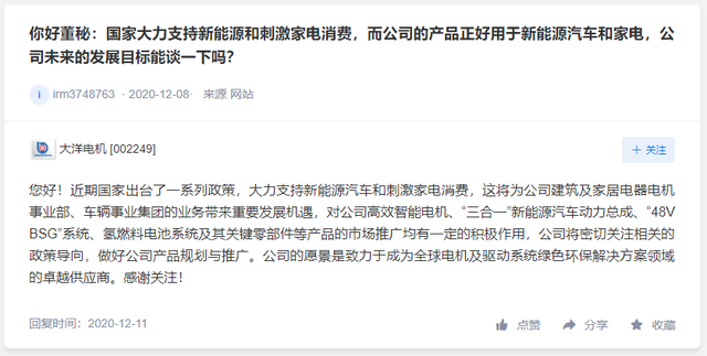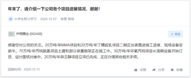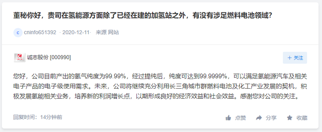 「氢问董秘」是氢云链旗下的全新栏目,主要包含投资者在互动平台上针对氢能、燃料电池等内容方面进行提问和相关企业的回复,每天一期。在这里,你可以全面了解企业的氢能发展动态。 诚志股份问: 董秘你好,贵司在氢能源方面除了已经在建的加氢站之外,有没有涉足燃料电池领域? 诚志股份答: 您好,公司目前产出的氢气纯度为99.99%,经过提纯后,纯度可达到99.9999%,可以满足氢能源汽车及相关电子产品的电子级使用需求。未来,公司将继续充分利用长三角城市群燃料电池及化工产业发展的契机,积极发展氢能相关业务,培养新的利润增长点,以期形成良好的经济效益和社会效益。感谢您对公司的关注。 齐翔腾达问: 年末了,请介绍一下公司各个项目进展情况,谢谢! 齐翔腾达答: 感谢您对公司的关注。20万吨/年MMA项目和20万吨/年丁腈胶乳项目二期正加紧推进施工进度,现场设备安装中。70万吨/年丙烷脱氢项目土建和部分装置框架正在施工中。30万吨/年环氧丙烷项目长周期设备开始订货,设计图纸对接中。20万吨/年异壬醇项目立项已完成,正在办理其他相关手续。 大洋电机问: 你好董秘:国家大力支持新能源和刺激家电消费,而公司的产品正好用于新能源汽车和家电,公司未来的发展目标能谈一下吗? 大洋电机答: 您好!近期国家出台了一系列政策,大力支持新能源汽车和刺激家电消费,这将为公司建筑及家居电器电机事业部、车辆事业集团的业务带来重要发展机遇,对公司高效智能电机、“三合一”新能源汽车动力总成、“48V BSG”系统、氢燃料电池系统及其关键零部件等产品的市场推广均有一定的积极作用,公司将密切关注相关的政策导向,做好公司产品规划与推广。公司的愿景是致力于成为全球电机及驱动系统绿色环保解决方案领域的卓越供应商。感谢关注! 编辑:氢氢我心 校对:风 免责声明:本文观点不构成投资建议,请谨慎对待 |