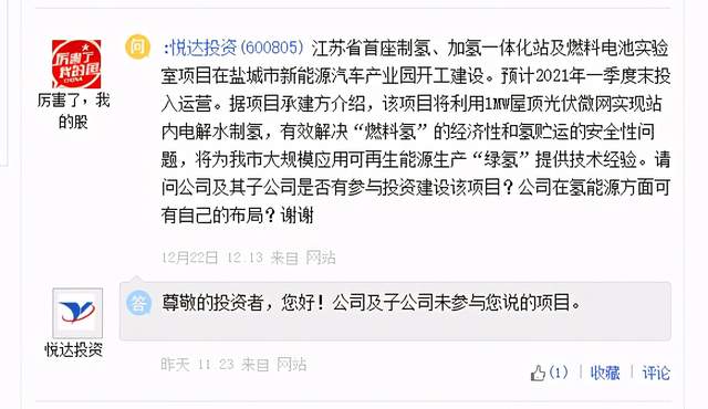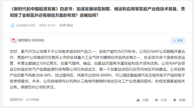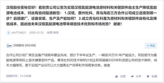 「氢问董秘」是氢云链旗下的全新栏目,主要包含投资者在互动平台上针对氢能、燃料电池等内容方面进行提问和相关企业的回复,每天一期。在这里,你可以全面了解企业的氢能发展动态。 悦达投资问: 江苏省首座制氢、加氢一体化站及燃料电池实验室项目在盐城市新能源汽车产业园开工建设。预计2021年一季度末投入运营。据项目承建方介绍,该项目将利用1MW屋顶光伏微网实现站内电解水制氢,有效解决“燃料氢”的经济性和氢贮运的安全性问题,将为我市大规模应用可再生能源生产“绿氢”提供技术经验。请问公司及其子公司是否有参与投资建设该项目?公司在氢能源方面可有自己的布局?谢谢 悦达投资答: 尊敬的投资者,您好!公司及子公司未参与您说的项目。 诚志股份问: 《新时代的中国能源发展》白皮书:加速发展绿氢制取、储运和应用等氢能产业链技术装备。贵司除了会制氢外还有哪些方面的布局?进展如何? 诚志股份答: 您好,氢气作为公司旗下子公司南京诚志的产品之一,目前产能约为5万吨/年。公司已与AP公司顺畅开展合作,美国AP公司是纽约交易所上市的全球最大工业气体与精细化学品供应商之一,在全球30多个国家投资运营,年营业额超过100亿美元,在氢气提纯、储运、加氢站方面有丰富经验和技术领先优势。公司与AP合资设立的诚志空气产品氢能源科技有限公司已完成设立,第一个加氢站项目已在苏州地区开始建设。公司目前产出的氢气纯度为99.99%,经过提纯后,纯度可达到99.9999%,可以满足氢能源汽车及相关电子产品的电子级使用需求。未来,公司将继续充分利用长三角城市群燃料电池及化工产业发展的契机,积极发展氢能相关业务。感谢您对公司的关注。 汉缆股份问: 汉缆股份董秘您好!看到贵公司公告为实现汉缆氢能源电池原材料和关键部件自主生产降低氢能源电池成本,对此有些问题请教您: 1.汉缆、惠州杜科、青岛海岩三方合作公司成立进度到哪一步?后续建厂、设备安装、生产及产能如何? 2.成立青岛杜科是为原材料和关键部件自有化及降低成本,因此给未来汉缆氢能源电池带来哪些技术优势和市场优势? 谢谢! 汉缆股份答: 合作公司计划厂房及设备产线明年建设完成,预计下半年试生产,一期按30万片/年产能设计。双极板作为氢能电源系统的上游关键零部件产品,青岛杜科的技术指标计划达到或超越2020年科技部公布的技术指标,成本大幅降低,易于实现产业化可以大大提高生产效率和市场竞争优势。谢谢 编辑:氢氢我心 校对:风 免责声明:本文观点不构成投资建议,请谨慎对待 |