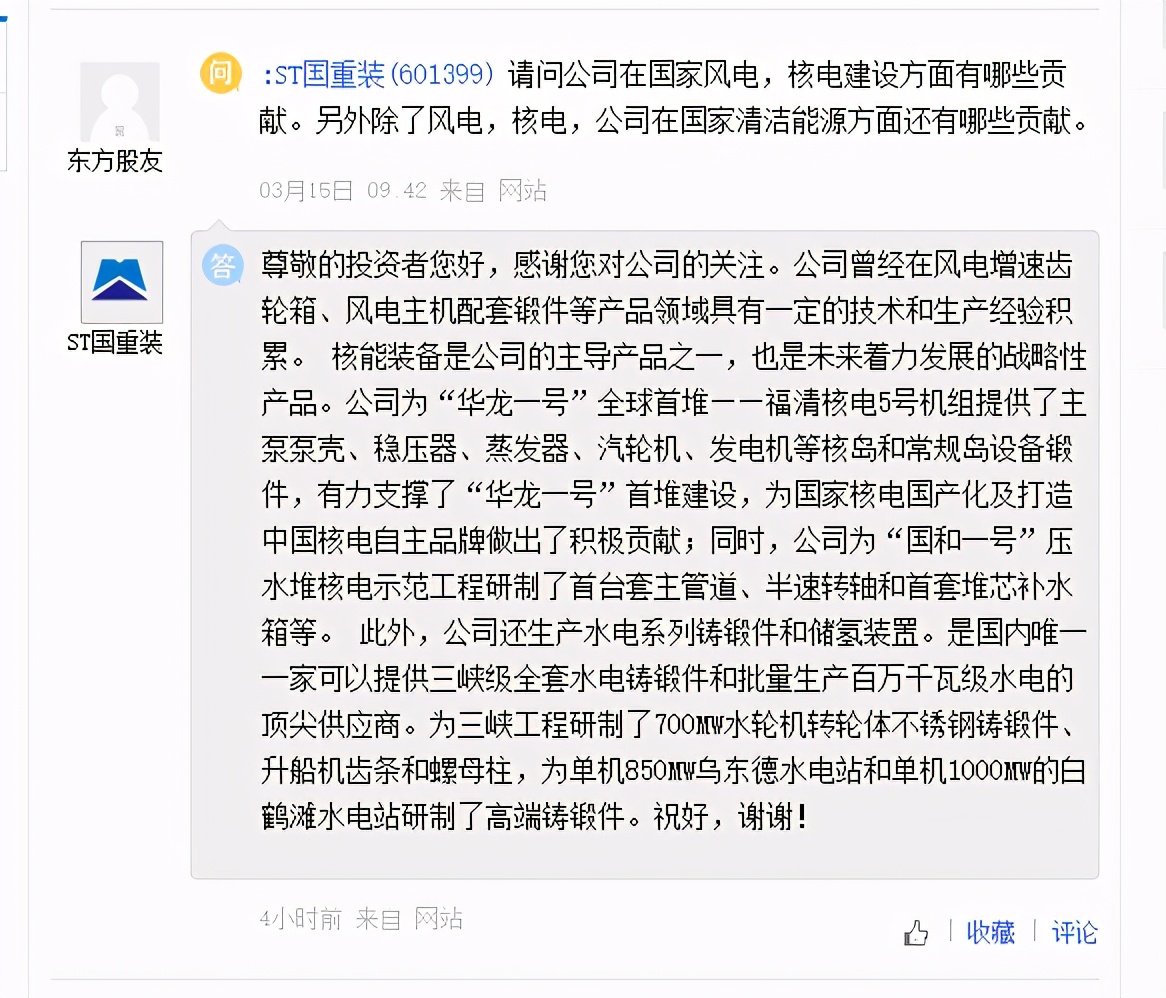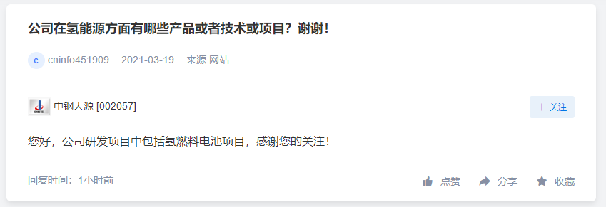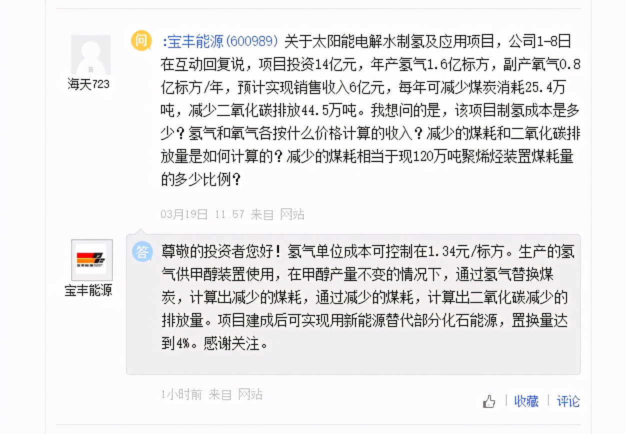 「氢问董秘」是氢云链旗下的全新栏目,主要包含投资者在互动平台上针对氢能、燃料电池等内容方面进行提问和相关企业的回复,每天一期。在这里,你可以全面了解企业的氢能发展动态。 ST国重装问: 请问公司在国家风电,核电建设方面有哪些贡献。另外除了风电,核电,公司在国家清洁能源方面还有哪些贡献。 ST国重装答: 尊敬的投资者您好,感谢您对公司的关注。公司曾经在风电增速齿轮箱、风电主机配套锻件等产品领域具有一定的技术和生产经验积累。 核能装备是公司的主导产品之一,也是未来着力发展的战略性产品。公司为“华龙一号”全球首堆——福清核电5号机组提供了主泵泵壳、稳压器、蒸发器、汽轮机、发电机等核岛和常规岛设备锻件,有力支撑了“华龙一号”首堆建设,为国家核电国产化及打造中国核电自主品牌做出了积极贡献;同时,公司为“国和一号”压水堆核电示范工程研制了首台套主管道、半速转轴和首套堆芯补水箱等。 此外,公司还生产水电系列铸锻件和储氢装置。是国内唯一一家可以提供三峡级全套水电铸锻件和批量生产百万千瓦级水电的顶尖供应商。为三峡工程研制了700MW水轮机转轮体不锈钢铸锻件、升船机齿条和螺母柱,为单机850MW乌东德水电站和单机1000MW的白鹤滩水电站研制了高端铸锻件。祝好,谢谢! 宝丰能源问: 关于太阳能电解水制氢及应用项目,公司1-8日在互动回复说,项目投资14亿元,年产氢气1.6亿标方,副产氧气0.8亿标方/年,预计实现销售收入6亿元,每年可减少煤炭消耗25.4万吨,减少二氧化碳排放44.5万吨。我想问的是,该项目制氢成本是多少?氢气和氧气各按什么价格计算的收入?减少的煤耗和二氧化碳排放量是如何计算的?减少的煤耗相当于现120万吨聚烯烃装置煤耗量的多少比例? 宝丰能源答: 尊敬的投资者您好!氢气单位成本可控制在1.34元/标方。生产的氢气供甲醇装置使用,在甲醇产量不变的情况下,通过氢气替换煤炭,计算出减少的煤耗,通过减少的煤耗,计算出二氧化碳减少的排放量。项目建成后可实现用新能源替代部分化石能源,置换量达到4%。感谢关注。 中钢天源问: 公司在氢能源方面有哪些产品或者技术或项目?谢谢! 中钢天源答: 您好,公司研发项目中包括氢燃料电池项目,感谢您的关注 编辑:氢氢我心 校对: 免责声明:本文观点不构成投资建议,请谨慎对待 |